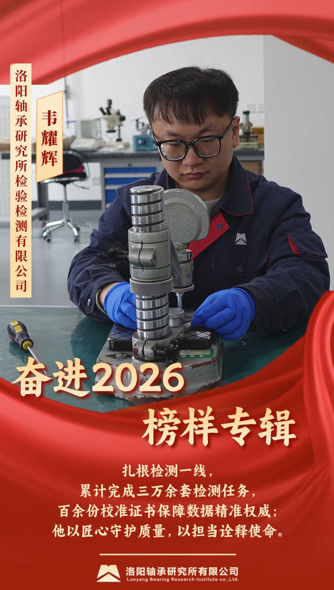 韦耀辉同志从事轴承检测与校准一线工作,累计完成检测任务三万余套,独立出具校准证书百余份,确保各类数据真实可靠,切实守护产品质量底线。他积极参与技术规范建设,编写作业指导书并参与校准规范修订,在质量监督抽查及“双创”项目中发挥重要作用。并通过持续学习与深入实践,不断提升专业水平。作为共青团员,他主动承担急难任务,严守质量安全底线,经手产品无质量事故,班组全年安全生产零事故。他在平凡岗位上以实际行动守护产品质量,为企业发展贡献力量。