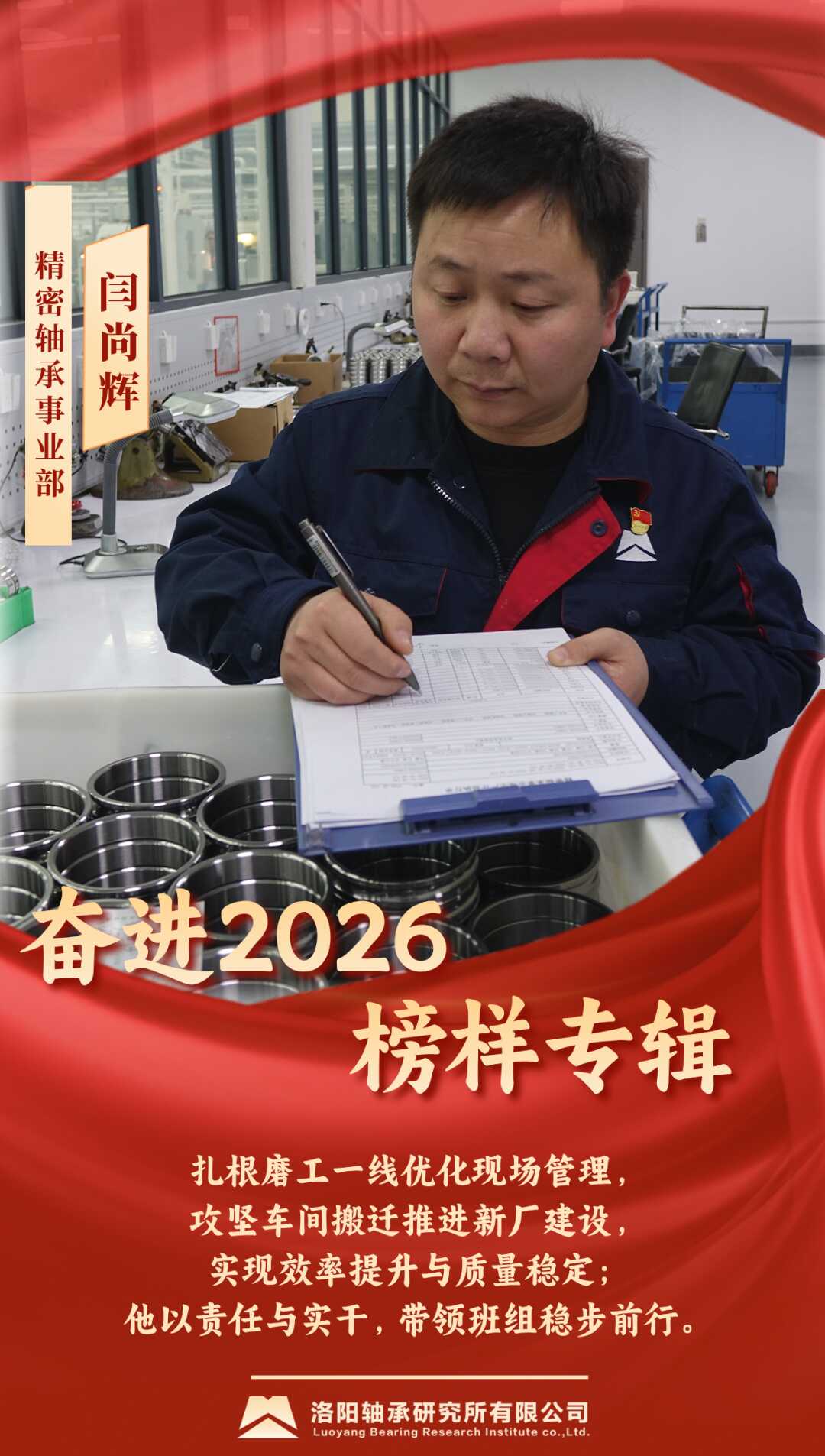 闫尚辉作为精密轴承磨工车间班组长,始终扎根生产一线,以务实的作风和过硬的本领,带领团队圆满完成各项任务。在磨工现场管理中,他持续优化生产秩序,推动车间面貌焕然一新,产品不良率显著下降,生产效率大幅提升,现场管理水平实现新飞跃。面对新厂区搬迁任务,他牵头制定详细进度计划,将设备拆卸、运输、安装、调试等环节细化到人,并带队驻扎现场,确保搬迁高效推进,最终提前完成整体搬迁任务。他以高度的责任心和使命感,在平凡岗位上创造了不平凡的业绩。