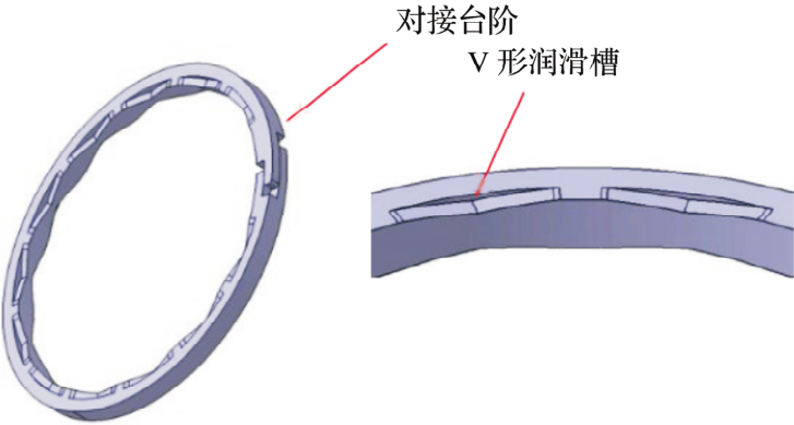 通过在轴槽侧壁上滑动的密封圈表面设置V形润滑槽,实现低摩擦力矩密封圈的低摩擦力矩和低漏油。密封圈采用在 PEEK树脂中加入特殊添加剂制成的 BEAREEPK5301材料,侧面有注塑成型的V形润滑槽,且对接台阶形状复杂。通过对接台阶的复杂形状减少对接台阶处的漏油。