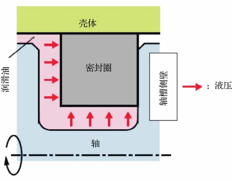 带矩形横截面的NTN常规密封圈的应用如图2所示。由于密封圈与轴槽侧壁的接触面积小于密封圈与壳体内表面的接触面积,当轴或壳体旋转时,轴槽侧壁的滑动阻力较小,密封圈在轴槽侧壁上滑动。密封圈与轴槽侧壁是面接触,因此漏油较少。