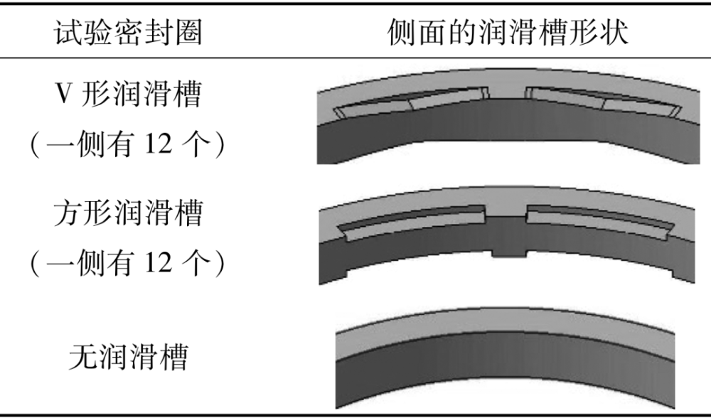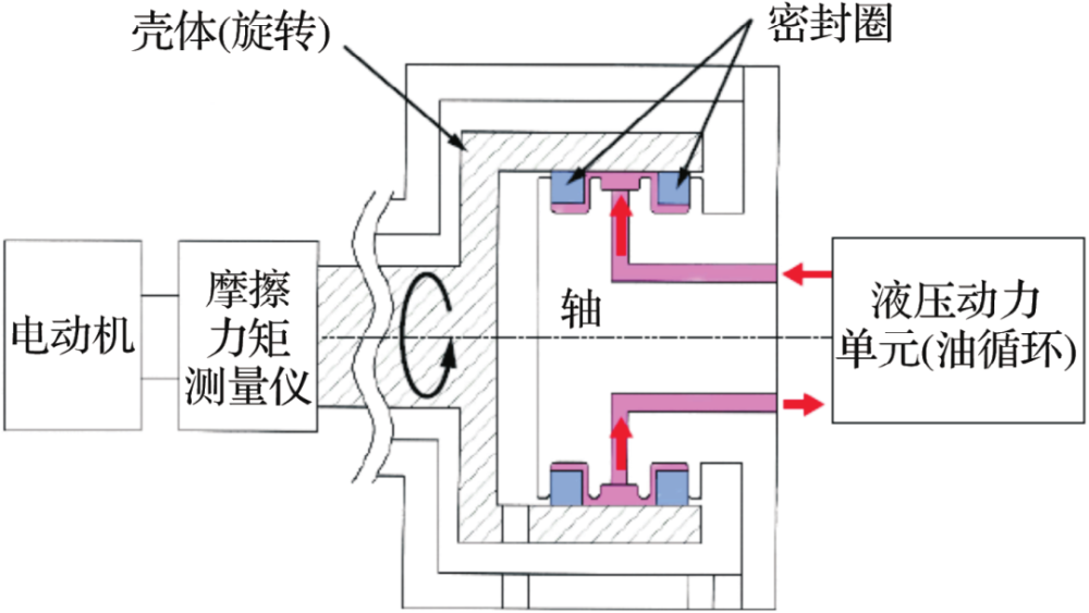 具有不同润滑槽形状和无润滑槽的3种密封圈对比见表1。试验设备示意图如图3所示。通过安装在轴槽上的2个密封圈之间的循环油施加油压并旋转壳体,从而实现摩擦力矩的测量。