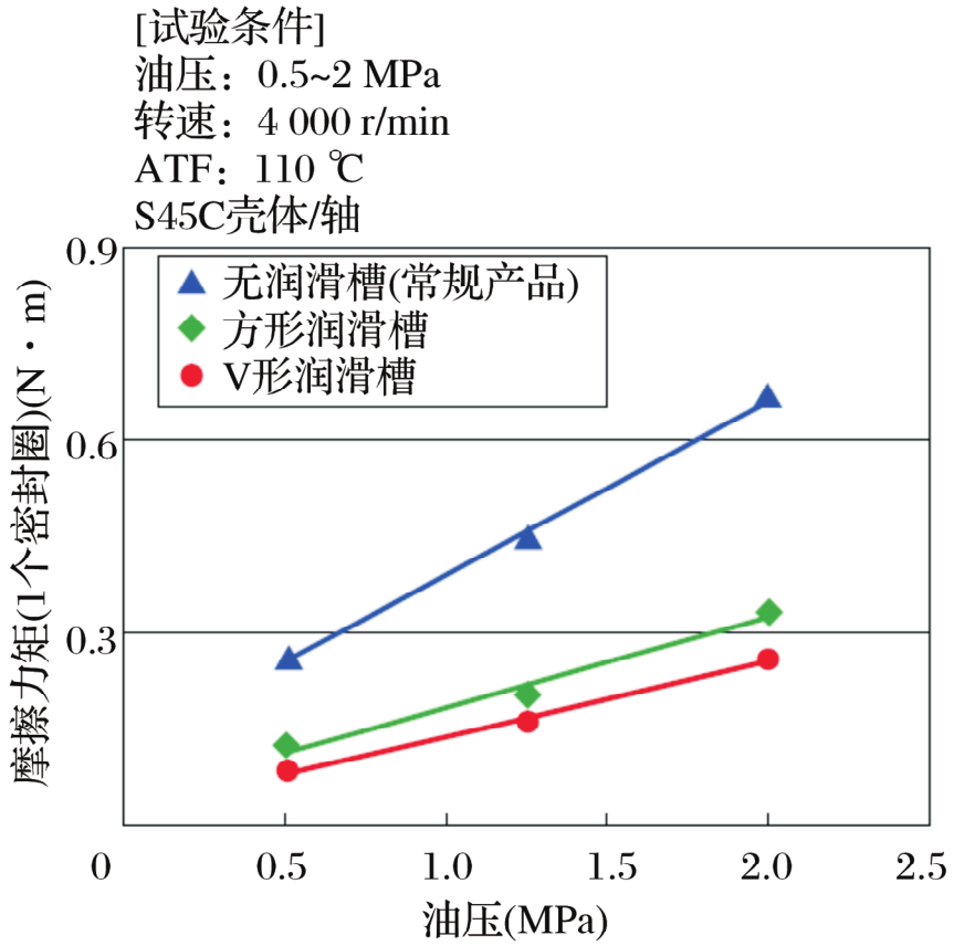 油压与摩擦力矩的关系如图4所示。将测得的2个密封圈的摩擦力矩除以2得到1个密封圈的摩擦力矩。带V形润滑槽密封圈的摩擦力矩比无润滑槽密封圈(NTN的常规产品)的低60%~70%,比带方形润滑槽密封圈的低20%。