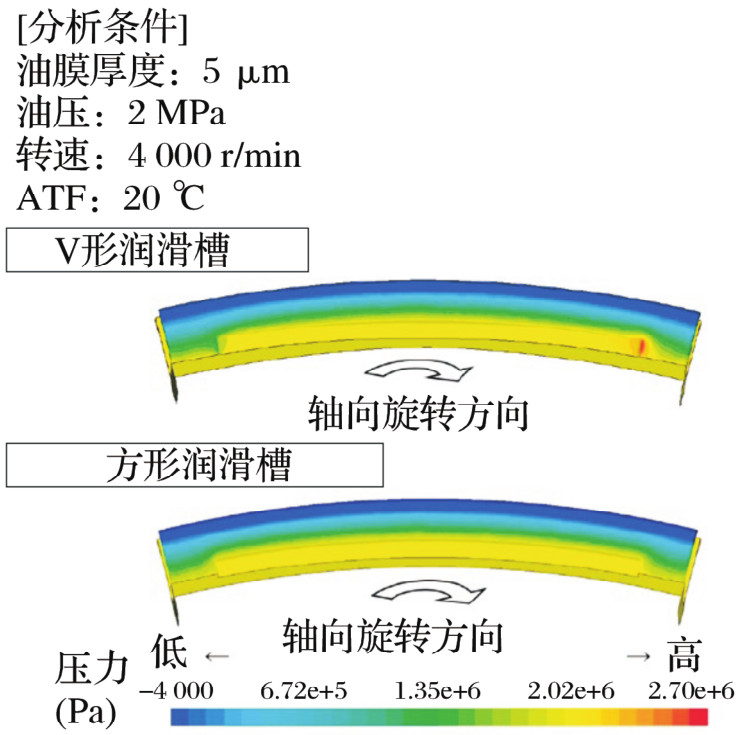 摩擦力矩测量结果和滑动表面的油膜压力分布显示,出现在V形润滑槽端部的力与由于油膜压力(油膜反作用力)导致摩擦力矩降低的力方向相反。油膜反作用力越大,摩擦力矩越低。因此,可认为V形润滑槽数量越多,宽度越宽,油膜反作用力越大。流体分析证实了这点。
