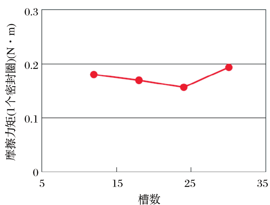 然而,当槽数增加时,槽间的空格数也增加,这增加了密封圈侧面与轴槽侧壁的接触面积,从而导致摩擦力矩升高。因此,应有最优槽数使摩擦力矩最小。为证实这点,制作了不同槽数的密封圈并测量摩擦力矩。密封圈尺寸为:外径51 mm,厚度2.4 mm,宽度2.3 mm。一侧槽数为12~30。槽间距、槽宽、槽角相同,因此槽长和槽深随着槽数不同而不同。测量条件为:ATF压力1 MPa,温度80 ℃,转速2 000 r/min。