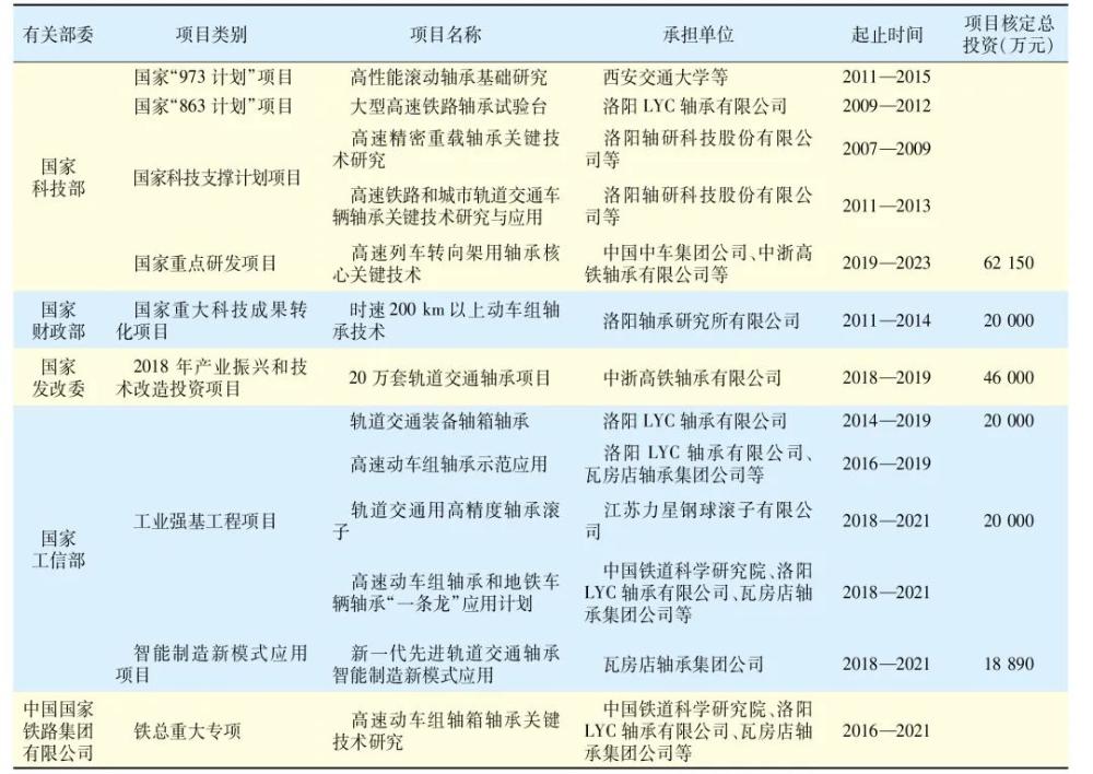 高速铁路是战略性新兴产业,是制造强国战略的重点领域。国产高速动车组及配套轴承的开发应用引起了国家有关部委的高度重视和社会各界的广泛关注。十多年来,国家有关部委实施了一系列支持国产高速动车组轴承开发应用的政策项目,见表5(据不完全统计,这些项目核定总投资近19亿元)。